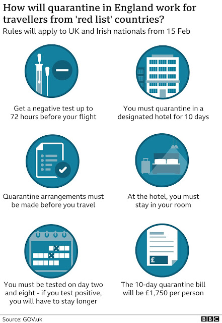 One story I read which makes me laugh is that British and Irish citizens and UK residents who arrive in England after being in a high-risk COVID country now have to self-isolate in hotels. The reason it made me laugh is because these people who probably have a home to go to have to pre-book a stay at a government sanctioned hotel to stay in for ten days, but also have to pay for the privilege of been isolated. As well as the hotel fees [which rise if children are involved] there is a further charge incurred for an NHS test.